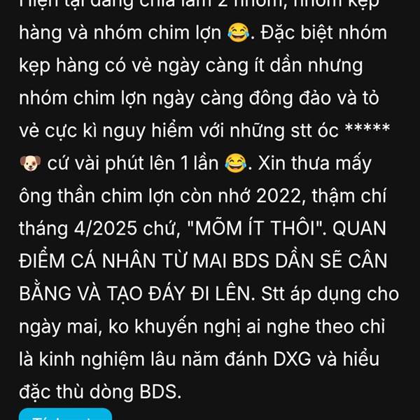 Hiện tại đang chia làm 2 nhóm, nhóm kẹp hàng và nhóm chim lợn 😂. Đặc biệt nhóm kẹp hàng có vẻ ngày càng ít dần nhưng nhóm chim lợn ngày càng đông đảo và tỏ vẻ cực kì nguy hiểm với những stt óc ***** ...Thêm