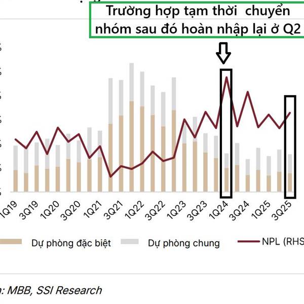 - Trong Quý 3 - Nợ xấu (NPL) của MBB tăng lên 1.87% nguyên nhân khách hàng trong lĩnh vực năng lượng tái tạo đang đàm phán lại hợp đồng mua bán điện (PPA) với EVN nên tạm thời bị chuyển nhóm, dự kiến ...Thêm