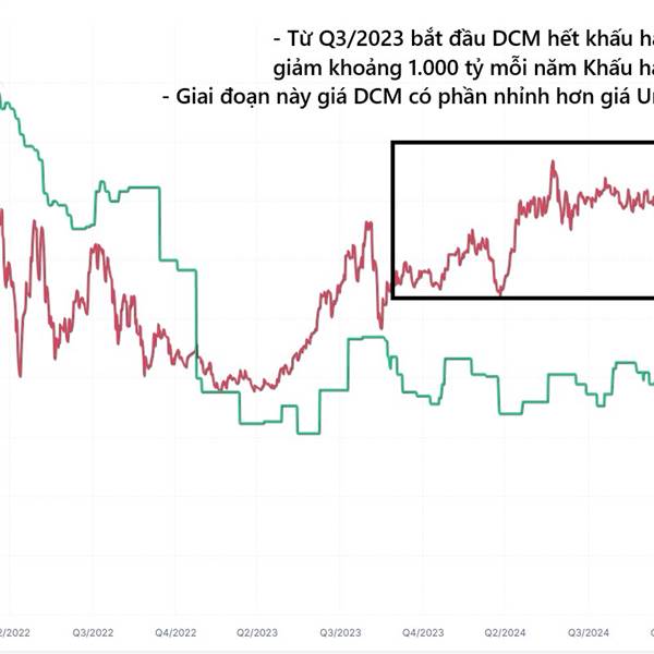 *** Mức độ tương quan của DCM và giá Ure trong nước: ... - Trong vòng 5 năm qua, giá cổ phiếu DCM gần như rất đồng pha với giá Ure trong nước - Tuy nhiên từ Quý 3/2023 giá của DCM có lúc chạy ngược pha k...Thêm