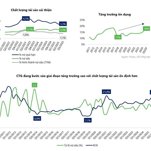 - Chất lượng tài sản của CTG tiếp tục dc cải thiện. khi tỷ lệ nợ xấu còn 1,09% giảm so với quý trước mà không cần sử dụng nhiều biện pháp xử lý rủi ro trong Q3/2025 (xử lý rủi ro 954 tỷ đồng trong quý ...Thêm