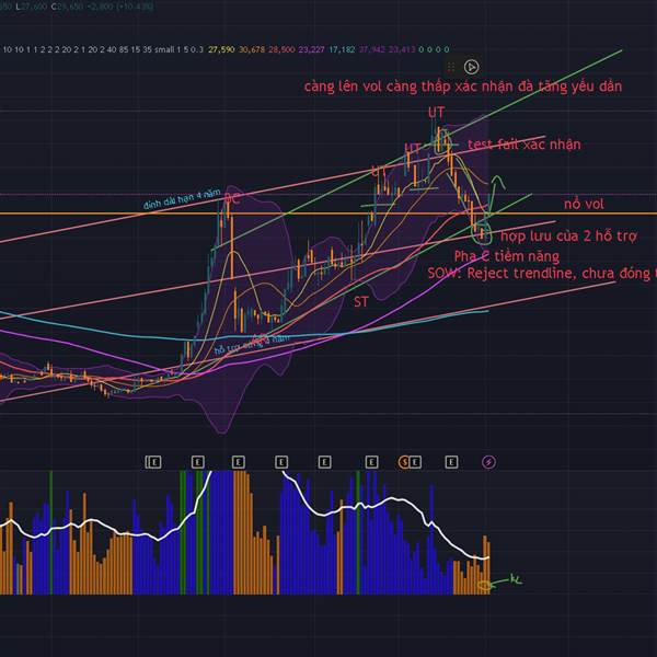 Hôm nay giá có phản ứng rút chân tại MA10, giá fail của vùng MA100 và MA200 khá dễ dàng, khẳng định lực cầu còn khá mạnh, nhưng vẫn chưa fail cây 19/1. Và vẫn có cầu đỡ. Target 31