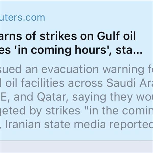 1h trước: Iran đã phát cảnh báo sơ tán khỏi nhiều cơ sở dầu lớn ở vùng vinh (Saudi, UAE, Quatar).