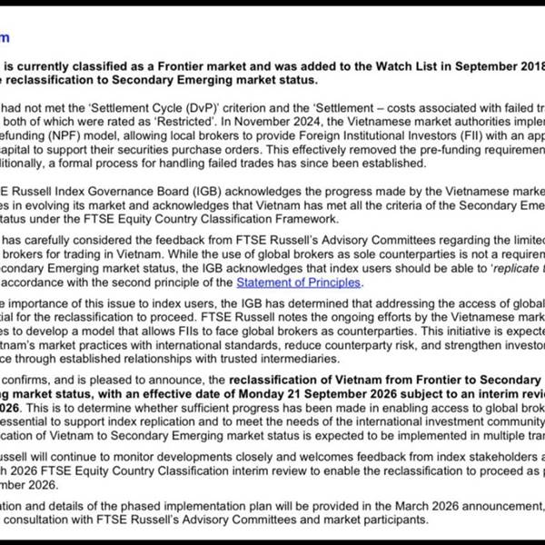 • FTSE sẽ xem xét lại (interim review) nhằm đánh giá tiến độ cho phép global brokers tiếp cận thị trườn...Thêm