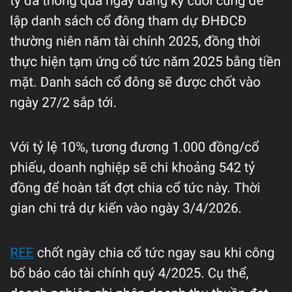 VSH: Ngày 13/2 là ngày giao dịch không hưởng quyền tạm ứng cổ tức đợt 3 năm 2025 của CTCP Thủy điện Vĩnh Sơn – Sông Hinh (VSH – HOSE) ngày đăng ký cuối cùng là 23/2. Theo đó, cổ tức sẽ được trả bằng t...