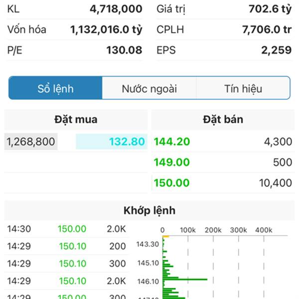 Các bác cho e hỏi nhỏ xíu . Sao giá đang 150 mà chất lệnh mua cuối phiên sàn ntn đc :(