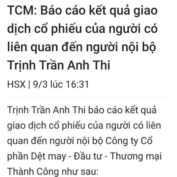 Vợ chủ tạch Tùng tuy có mua 20.000 cổ phiếu rất ít thôi nhưng bà ý mua xong thì TCM dính phiên sàn hôm thứ 2 tuần trước cả thị trường chung đều sàn.Nghĩa là giá bà ấy cao hơn 23.75.Những gì xấu xa nhấ...Thêm