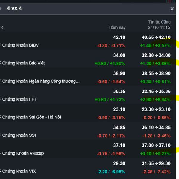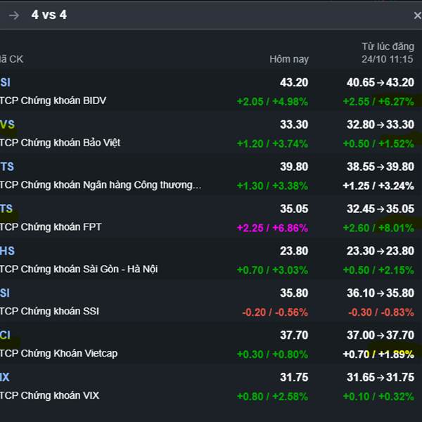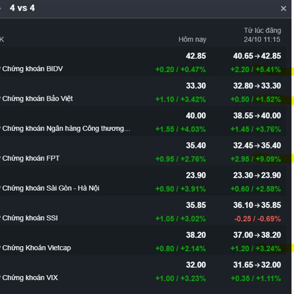4 vs 4 Tính tới hết phiên sáng Dòng giảm về đáy thuế quan (FTS BSI VCI BVS) đang tạm thời dẫn trước 1-0 so với dòng tạo nền giá trên đỉnh (VIX SHS SSI CTS)