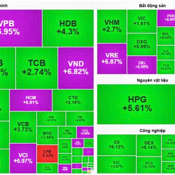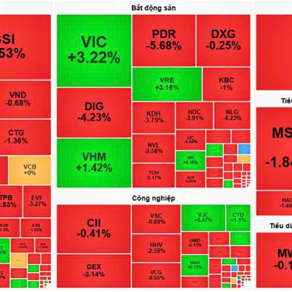Sắc đỏ tiếp tục bao phủ hầu hết các nhóm ngành/CP khi HSX có 229 mã đỏ + 59 mã đứng giá/85 mã xanh. Nhóm Vin (VIC,...Thêm