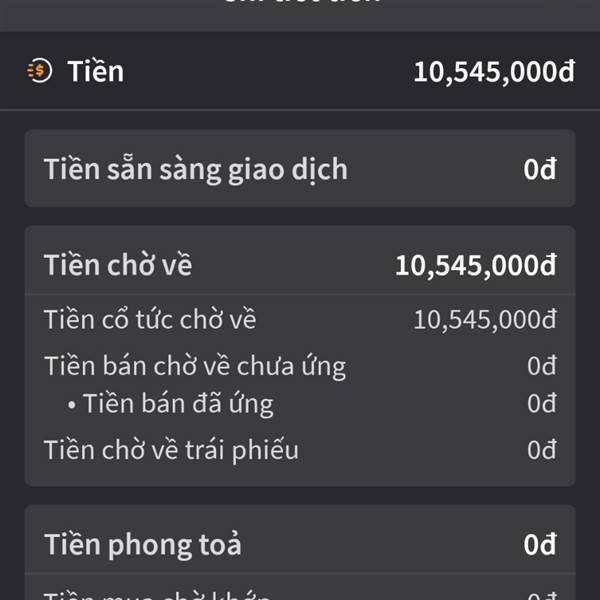 Bạn nào rành cho mình hỏi sao giá vốn của mình vừa điều chỉnh mà chỗ tiền chờ về vẫn có. Giá vốn của mình trước 34,3 mà giờ xuống 33,8 ( chắc do 500 đ cổ tức). Mình tưởng cổ tức tiền mặt thì giá vốn v...Thêm