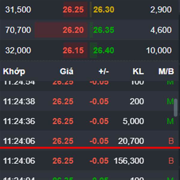 ủa như này là sao nhỉ? thằng nào cố tình bán giá thấp để ép giá xuống à? đang 26.35 xanh lè đùng cái nhảy 1 cục to đùng 26.25 để ép giá xuống là sao nhỉ?