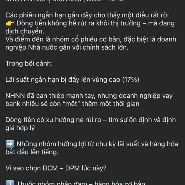 KHUYẾN NGHỊ MUA MỚI | DCM – DPM Các phiên ngắn hạn gần đây cho thấy một điều rất rõ: 👉 Dòng tiền không hề rút ra khỏi thị trường – mà đang dịch chuyển. Và điểm đến là nhóm cổ phiếu cơ bản, đặc biệt là d...Thêm