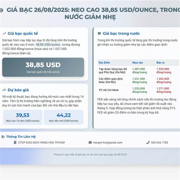 🗓 GIÁ BẠC 26/08/2025: NEO CAO 38,85 USD/OUNCE, TRONG NƯỚC GIẢM NHẸ