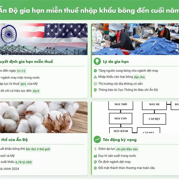 - Quyết định của Ấn Độ được dự báo sẽ tăng nhu cầu nhập khẩu bông ngắn hạn, đặc biệt từ Mỹ và Brazil – hai nguồn cung chính.