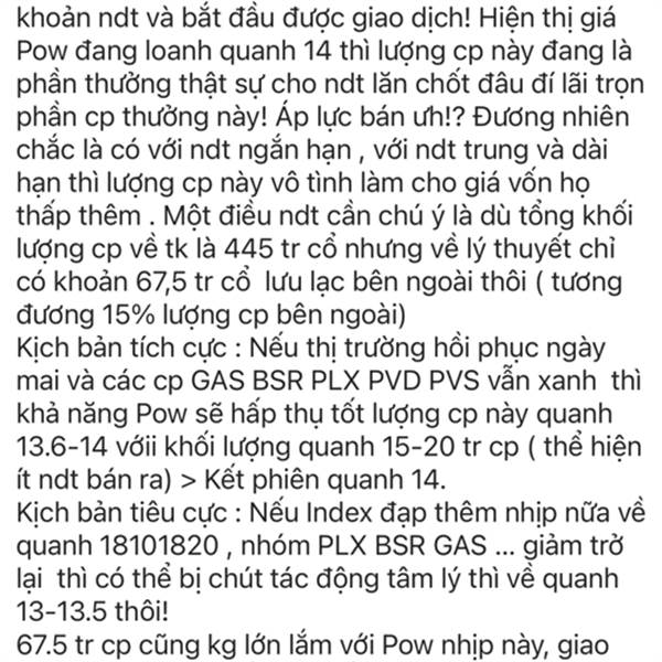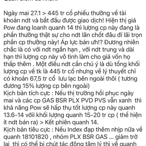 Ngày mai 27.1 > 445 tr cổ phiếu thưởng về tài khoản ndt và bắt đầu được giao dịch! Hiện thị giá Pow đang loanh quanh 14 thì lượng cp này đang là phần thưởng thật sự cho ndt lăn chốt ...Thêm