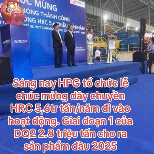 Sáng nay HPG tổ chức lễ chúc mừng dây chuyền HRC 5,6tr tấn/năm đi vào hoạt động. Việc này cũng đánh dấu một cột mốc quan trọng trong tiến độ triển khai Khu liên hợp thép Dung Quất 2