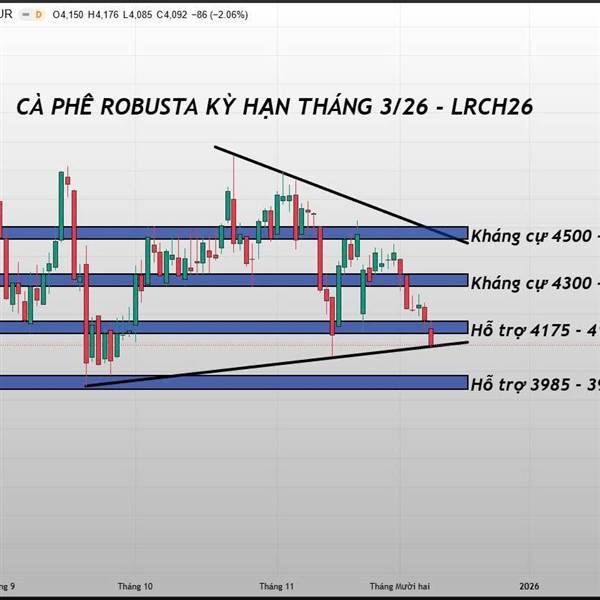CẬP NHẬT GIÁ CÀ PHÊ ROBUSTA THẾ GIỚI: Giá cà phê phiên tối hôm qua tiếp tục duy trì đà giảm và đã có tín hiệu gãy khỏi hỗ trợ quanh mốc 4175 - 4135. Hiện tại, giá đã giảm về lại trendline hỗ trợ trung...Thêm