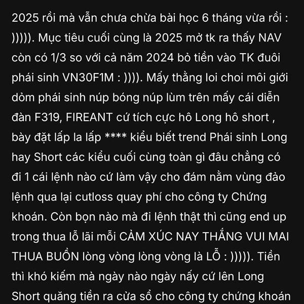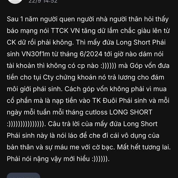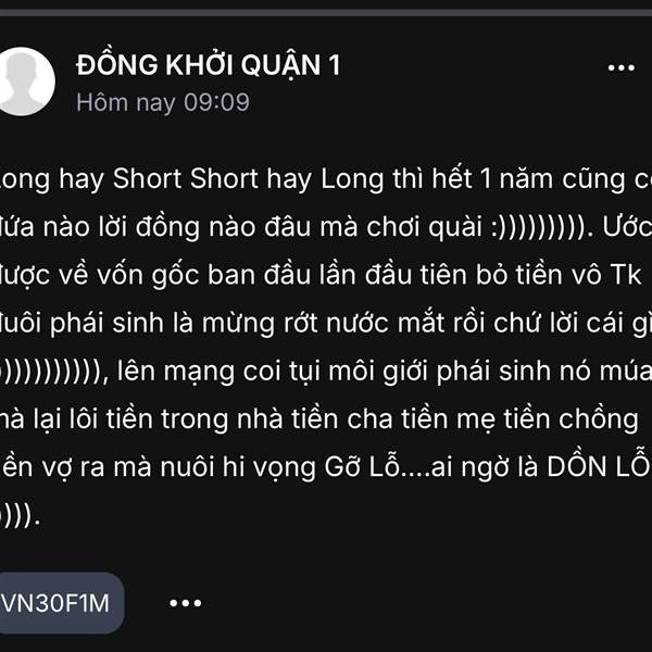 Long hay Short Short hay Long thì hết 1 năm cũng có đứa nào lời đồng nào đâu mà chơi quài :))))))))). Ước được về vốn gốc ban đầu lần đầu tiên bỏ tiền vô Tk đuôi phái sinh là mừng rớt nước mắt rồi chứ...Thêm