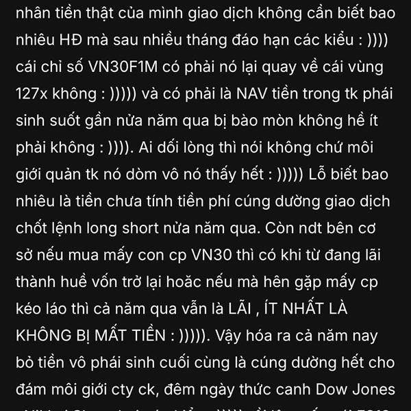 Có thèn nào con nào cầm được tiền lãi thậm chí nguyên vẹn vốn gốc ban đầu bước ra khỏi VN30f1m đâu mà cứ chơi quài :))))))))))))))).