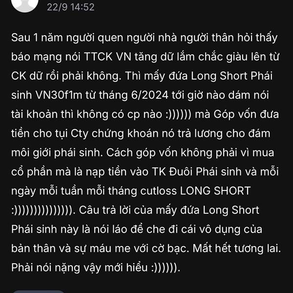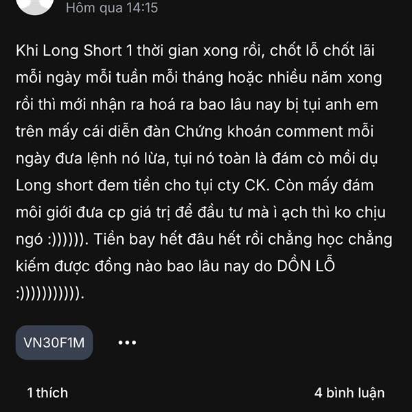 Khi Long Short 1 thời gian xong rồi, chốt lỗ chốt lãi mỗi ngày mỗi tuần mỗi tháng hoặc nhiều năm xong rồi thì mới nhận ra hoá ra bao lâu nay bị tụi anh em trên mấy cái diễn đàn Chứng khoán comment mỗi...Thêm