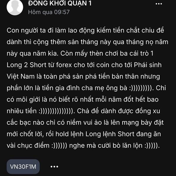 Con người ta đi làm lao động kiếm tiền chắt chiu để dành thì cộng thêm sản tháng này qua tháng nọ năm này qua năm kia. Còn mấy thèn chơi ba cái trò 1 Long 2 Short từ forex cho tới coin cho tới Phái si...Thêm