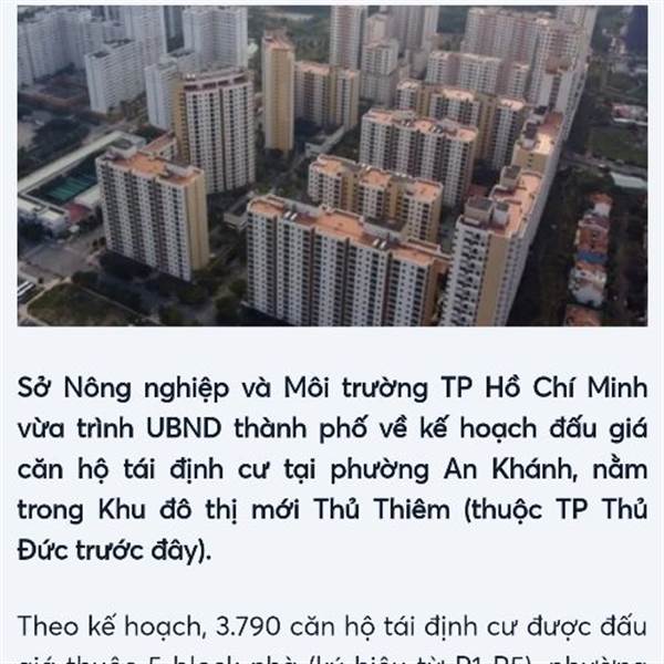 Sở Nông nghiệp và Môi trường TP.HCM đang tăng tốc hoàn tất các thủ tục định giá và đấu giá hàng loạt khu đất, căn hộ tại Khu đô thị mới Thủ Thiêm, trong đó đáng chú ý là kế hoạch đưa 3.790 căn hộ tái định cư tại phường An Khánh ra đấu giá ngay trong quý II/2026.