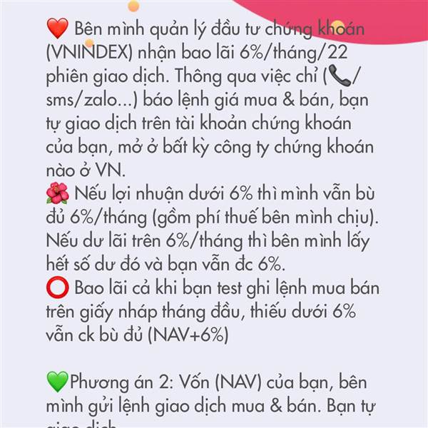 ❌ Finxanh (làm bên quỹ đầu tư) nhận bao lãi 7%/tháng. Thông qua việc chỉ Call/ sms/zalo báo lệnh (giá & khối lượng mua & bán), các bạn tự giao dịch trên tài khoản chứng khoán của chính các bạn. Thiếu ... Thêm
