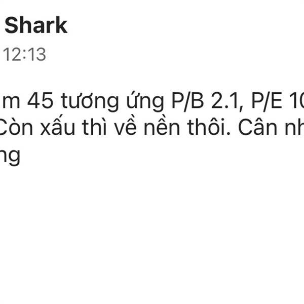 Giá hợp lý tầm 45 tương ứng P/B 2.1, P/E 10. Có sóng thì phải 5x. Còn xấu thì về nền thôi. Cân nhắc đc mất mà hành động