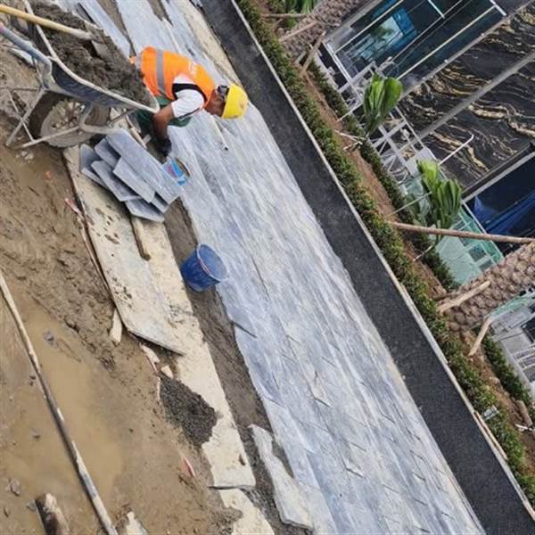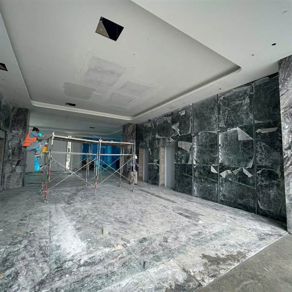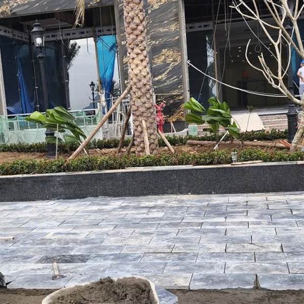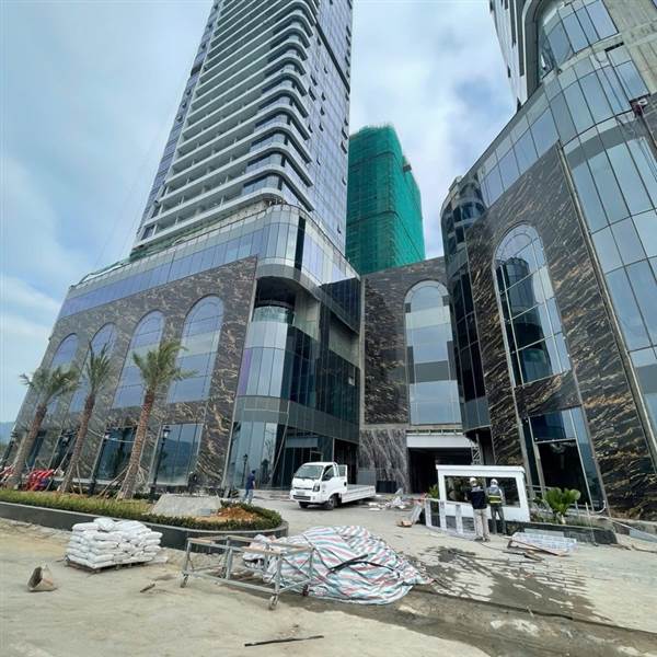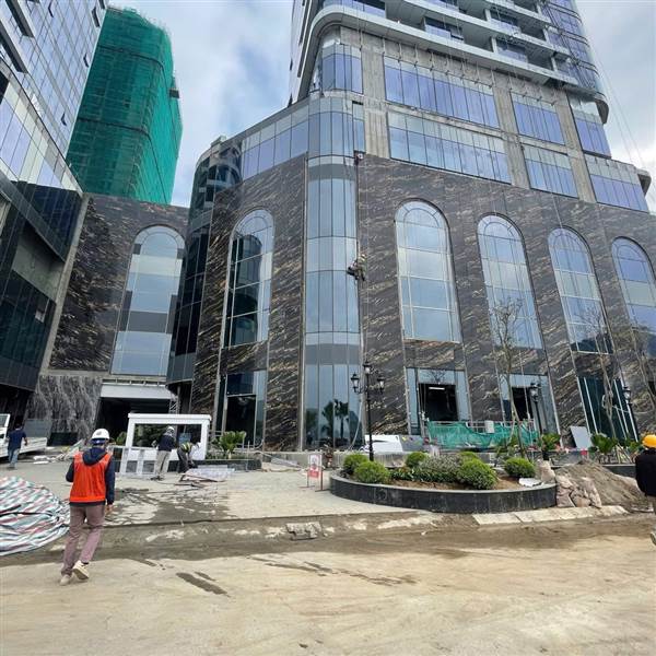 Bên trong hai tòa đã ốp lát gạch gần xong, vỉa hè đang được hoàn thiện từng phần.