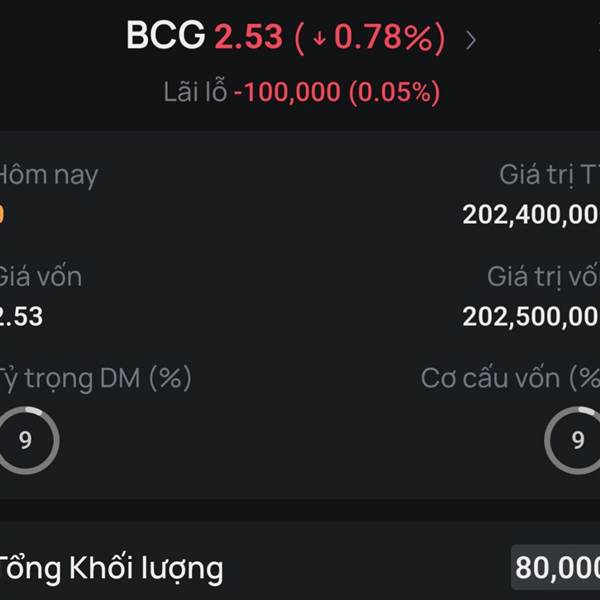 Vì quá yêu gia đình BCG, cổ đông BCG nên em ôm 80k cùng mọi người, đồng cam cộng khổ, có rau ăn rau, có cháo ăn cháo. Kính chúc các cổ đông BCG có lợi nhuận tốt ở những cp khác để bù đắp phần nào. Kín...Thêm