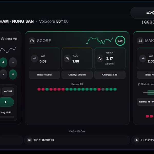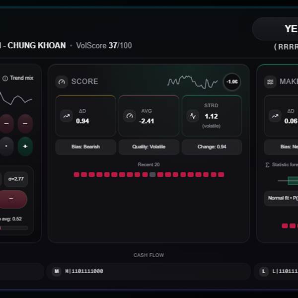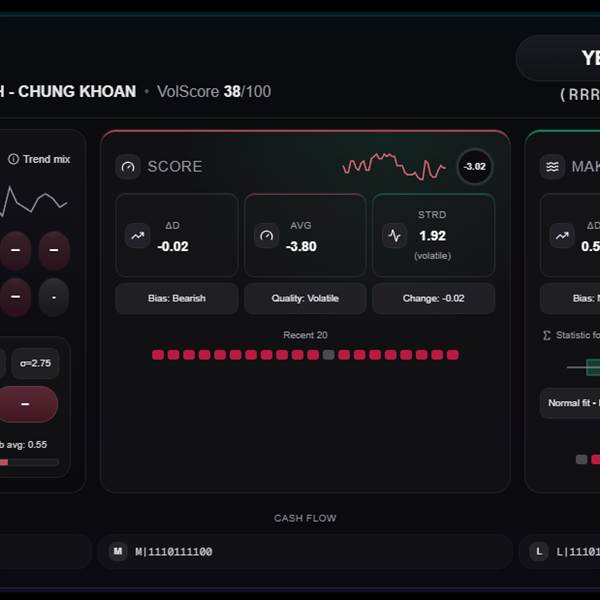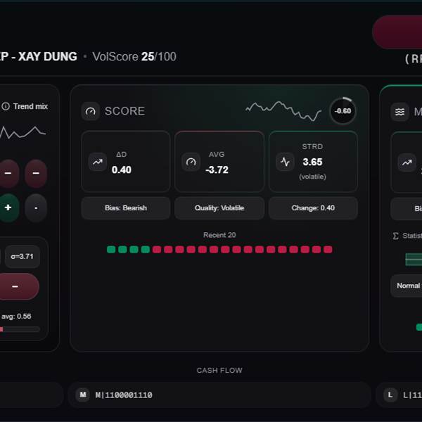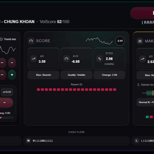 - Chỉ số Score (Dòng tiền NĐT cá nhân): Bias giảm, cải thiện vừa trong ngày, biến động mạnh.
