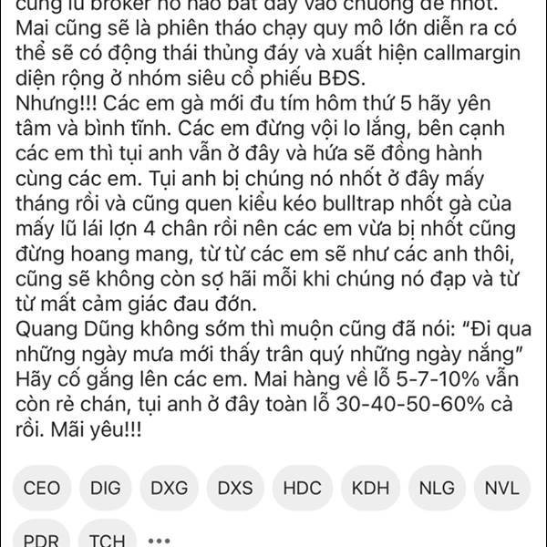Mai là phiên hàng về của phiên bulltrap hạng nặng ngày thứ 5 tím tái. Là phiên đưa các con gà mới F0 cùng lũ broker hô hào bắt đáy vào chuồng để nhốt. Mai cũng sẽ là phiên tháo chạy quy mô lớn diễn ra...Thêm