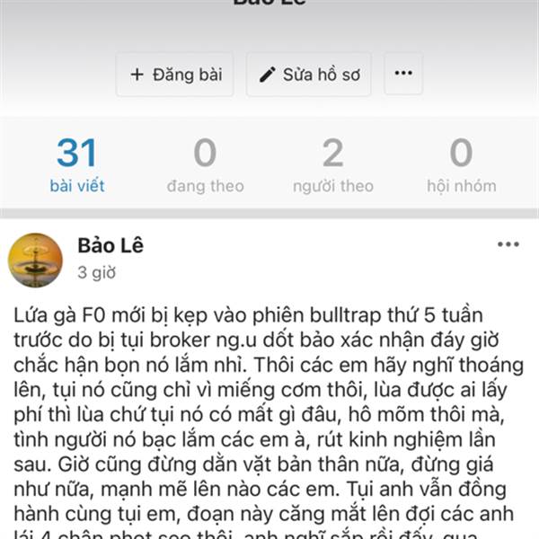Lứa gà F0 mới bị kẹp vào phiên bulltrap thứ 5 tuần trước do bị tụi broker ng.u dốt bảo xác nhận đáy giờ chắc hận bọn nó lắm nhỉ. Thôi các em hãy nghĩ thoáng lên, tụi nó cũng chỉ vì miếng cơm thôi, lùa...Thêm