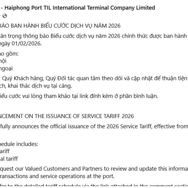 PHP chính thức nâng giá dịch vụ tại cảng Lạch Huyện 3,4 lên 10% bắt đầu từ ngày 1/2/2026