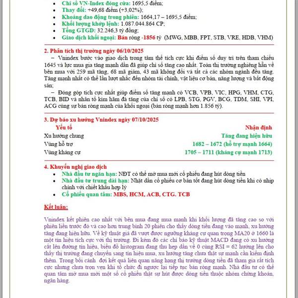 Tổng kết giao dịch ngày 06/10 và xu hướng ngày 07/10