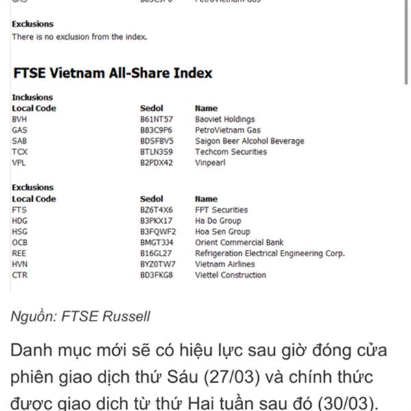 BSR, GAS vào rổ FTSE Vietnam Index!!!