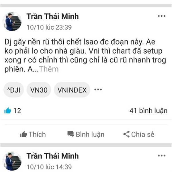 Dj gãy nền rũ thôi chết lsao đc đoạn này. Ae ko phải lo cho nhà giàu. Vni thì chart đã setup xong r có chỉnh thì cũng chỉ là cũ rũ nhanh trog phiên. Ae tự tin h chưa sập đc đâu
