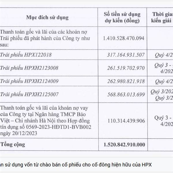 2024 HPX đã tính đến phương án phát hành cp để trả nợ trái phiếu. Và bằng 1 cách thần kỳ nào đó, kế hoạt phát hành chưa đc triển thì công ty còn lại 500 tỷ nợ trái phiếu.