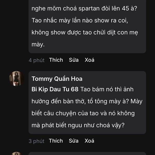 Có thằng ăn chặn tiền mặt trận tổ quốc, của đồng bào bão lụt bị tao chửi cho nhục quá, giờ xui cả choá ra sủa hộ. Chắc là tôi động đến bàn thờ, tổ tông nhà nó.