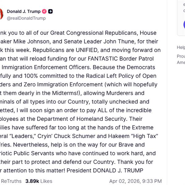 Đại ý là khen mấy ông Cộng Hòa thông qua dự luật cấp nhân sách cho DHS.