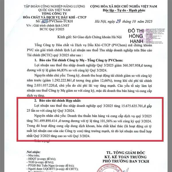 CHÍNH THỨC Lợi nhuận sau thuế của PVC quý 3/2025 cao gấp 25 lần so với cùng kì, do hoạt động cung cấp dịch vụ khoan, hoá chất khai thác tăng trưởng rất mạnh