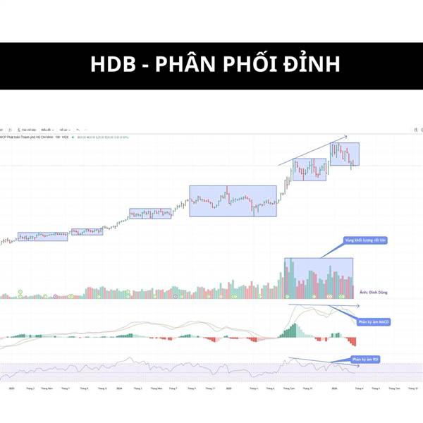 HDB đang giao dịch quanh vùng đỉnh lịch sử. Nhưng đã xuất hiện các dấu hiệu phân phối đỉnh. - Vùng khối lượng rất lớn - Nền giá số 6, nền cuối - Phân kỳ âm MACD - Phân kỳ âm RSI Đồ t...Thêm