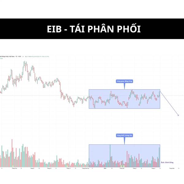 EIB đang giao dịch biên độ lớn, lỏng lẻo, cùng khối lượng giao dịch lớn. Mình cho rằng đây là vùng tái phân phối để tiếp tục giảm, chứ không phải tích lũy để vào pha tăng.