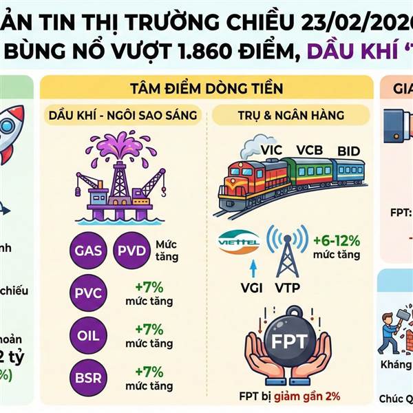 BẢN TIN THỊ TRƯỜNG CHIỀU 23/02/2026: VN-INDEX BÙNG NỔ VƯỢT 1.860 ĐIỂM, DẦU KHÍ "TÍM LỊM" 🔥 📊 Diễn biến chung: Thị trường có một phiên giao dịch đầu tuần cực kỳ thăng hoa. VN-Index đóng cửa tại mốc ca...Thêm
