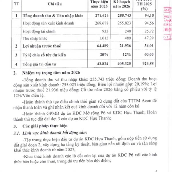 KHSXKD 2026 giảm so với 2025. Mục Lnst chỉ bằng 1/3, cổ tức tiếp tục được chia bằng cổ phiếu. Kdc Hữu Thạnh chưa đưa vào kinh doanh. Trong năm vẫn phải bơm hơn 300tỷ vào dự án Điểm trừ là KDC P6 mặc dù ...Thêm