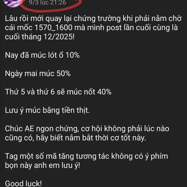 Nay ngày cuối mình giải ngân, sau phiên nay sẽ không còn nói tới việc mua bán gì nữa và chúng ta sẽ gặp nhau lại vào tháng 4/2026 để xem lãi lỗ ra sao.
