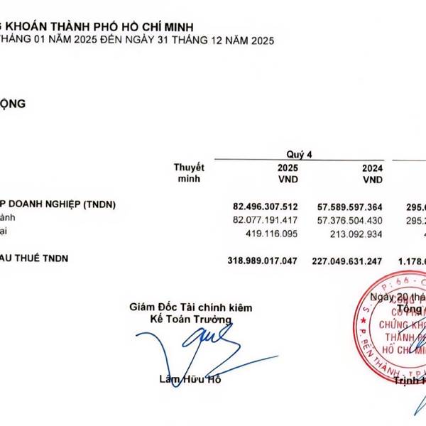 KQKD Quý 4 HCM: LNST 319ty tăng 40% cùng kỳ, cả năm 2025 LNST 1.179ty vs 1.040ty (2024)