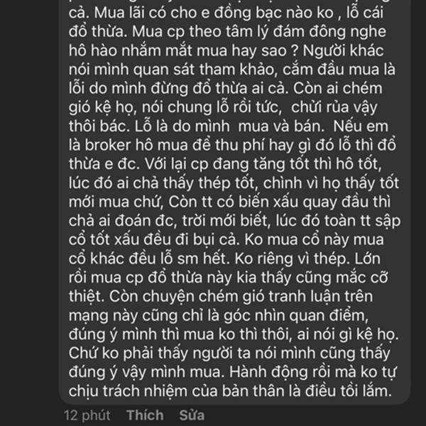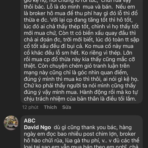 Ae cầm thép hôm nay là điều may mắn rồi, lỡ đu 17-18 giờ cũng chả lỗ nhiêu, sáng kéo xanh 2-3% có thể bán lỗ nhẹ, đỡ hơn bank ck bds ko, hầu như toàn ngành kể cả cổ mạnh đi ngược hổm nay, lỗ sặc máu...Thêm
