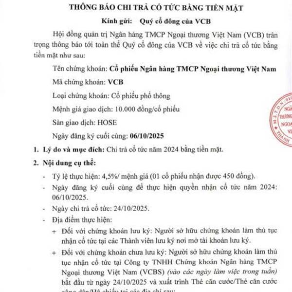 Thông tin VCB cổ tức tiền mặt 4,5% vào 4/10 đã chính xác chưa anh em? vừa múc thêm