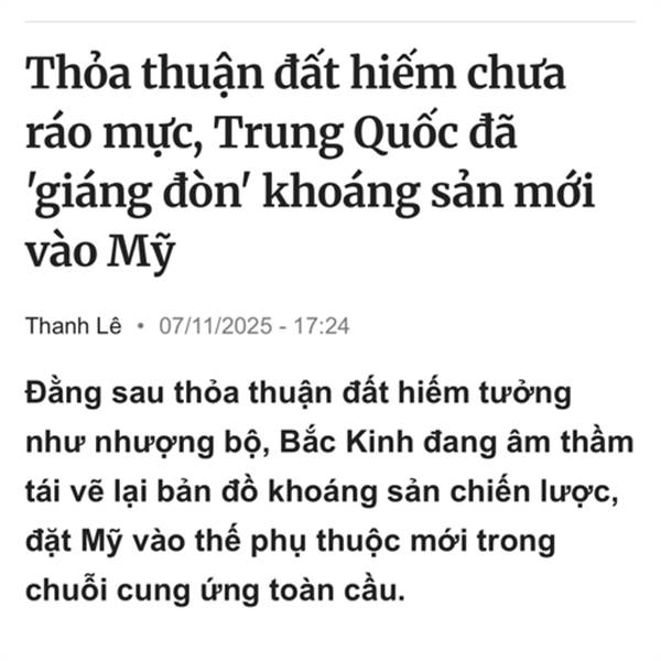 Đằng sau thỏa thuận đất hiếm tưởng như nhượng bộ, Bắc Kinh đang âm thầm tái vẽ lại bản đồ khoáng sản chiến lược, đặt Mỹ vào thế phụ thuộc mới trong chuỗi cung ứng toàn cầu.