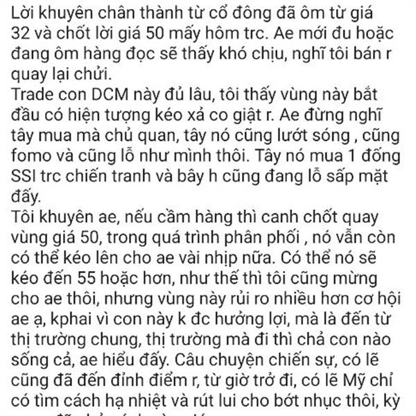 Lời khuyên chân thành từ cổ đông đã ôm từ giá 32 và chốt lời giá 50 mấy hôm trc. Ae mới đu hoặc đang ôm hàng đọc sẽ thấy khó chịu, nghĩ tôi bán r quay lại chửi. Trade con DCM này đủ lâu, tôi thấy vùng ...Thêm